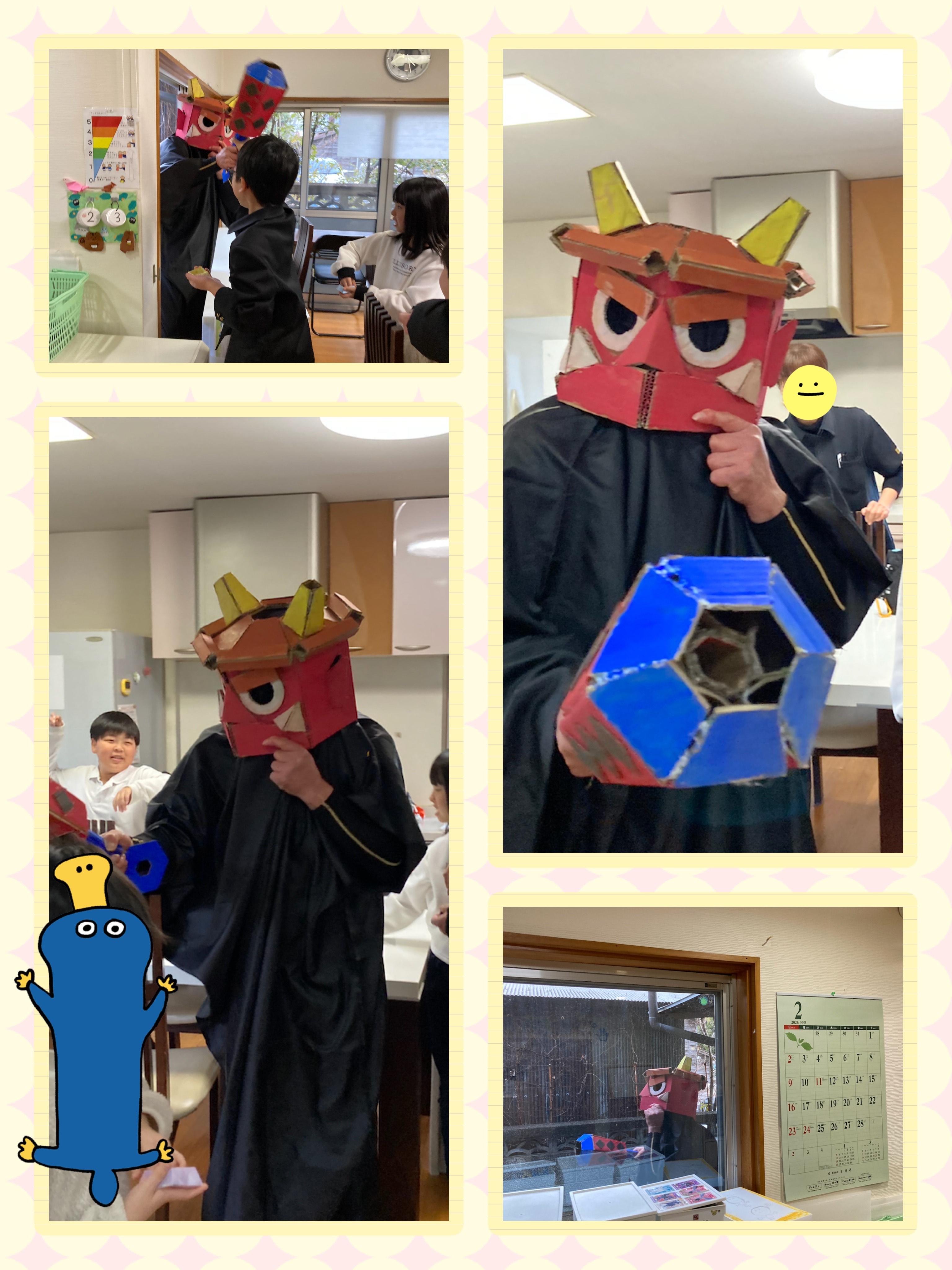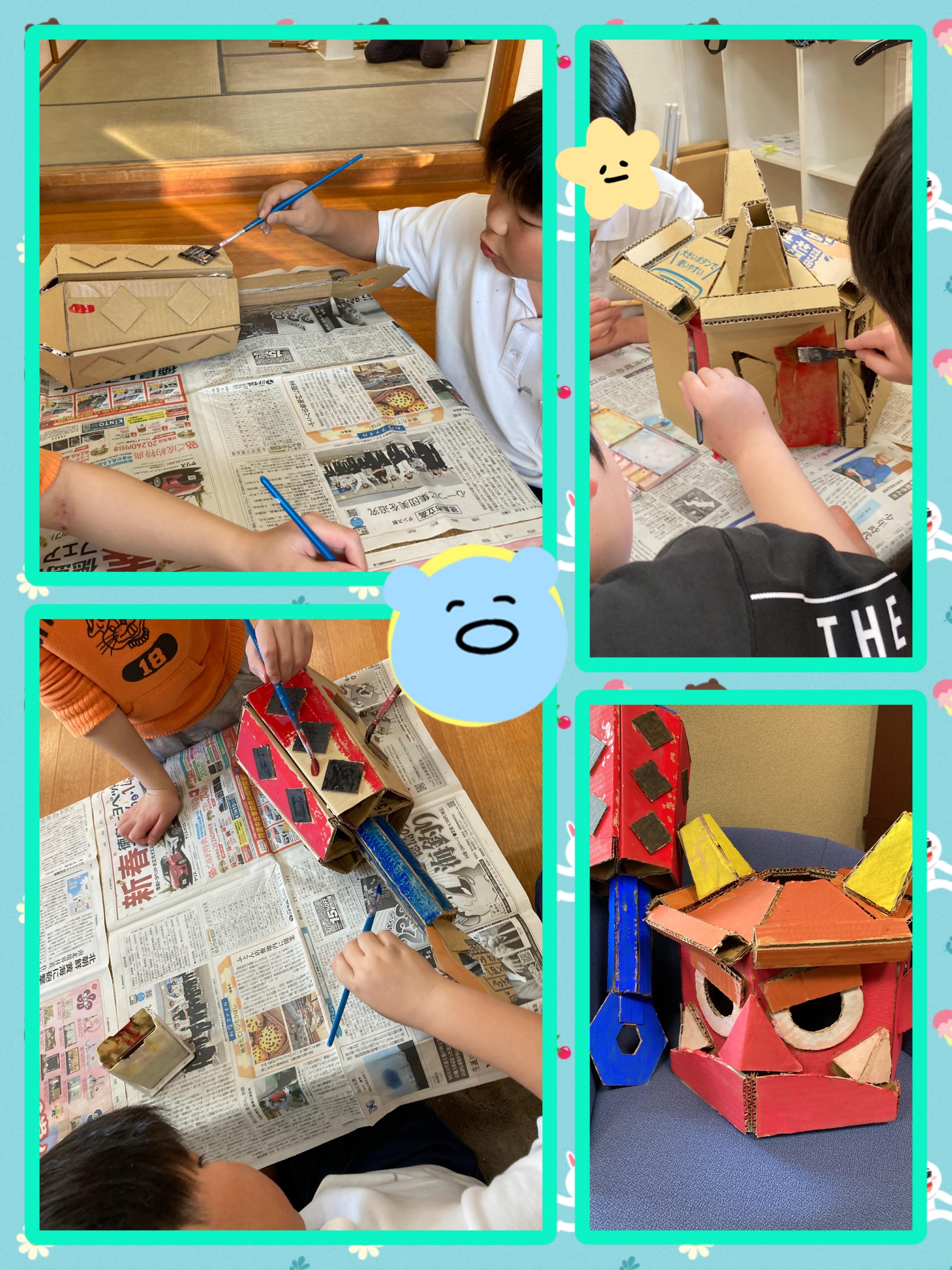 児童発達支援・放課後等デイサービス Familyぴーすです! 節分について載せていきます(^^) ![]() 節分の豆まきの為に 鬼のお面と金棒を作りました。 ダンボールに型を取って切り取り組み立てて色を塗り完成です✨ ![]() 鬼が現れると大きな声で 「鬼は外」 「福は内」 と元気よく豆を投げて 鬼さんも逃げていきました! 〒773-0015 徳島県小松島市中田町字千代ヶ原24番地の1 TEL0885-32-1234 児童発達支援・放課後等デイサービスFamilyぴーす |